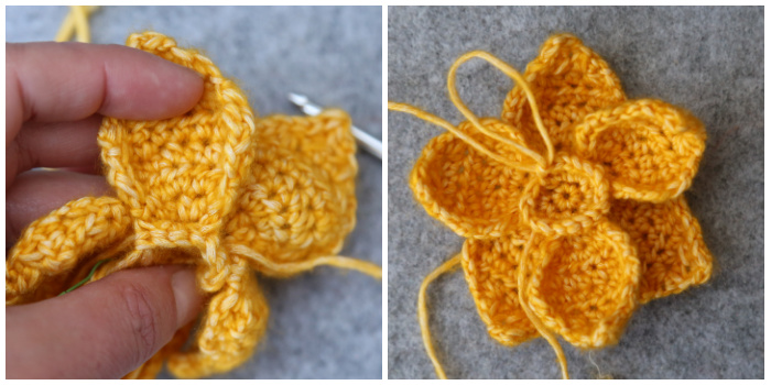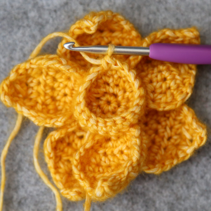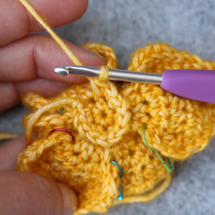 In this round, you will ‘catch’ the first, third, and fifth Petal by working into the marked hdc sts from Row 3 of the Petals. We will ignore the other three Petals (which you have hopefully pinned to the back).