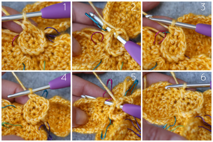 *Make 2 sc in the next st {Photo 4}, sc in the next st AND the first (marked) hdc of Row 3 of the next Petal together {Photos 5 and 6}. Bring your yarn to the front of the Petal**. Make 2 sc in the next st, sc in the next st AND the last (marked) hdc of Row 3 of the Petal together.*