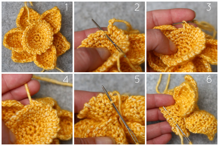 You can now work away all your ends except the long initial yarn end, which you will use to sew your daffodil onto your bouquet.
