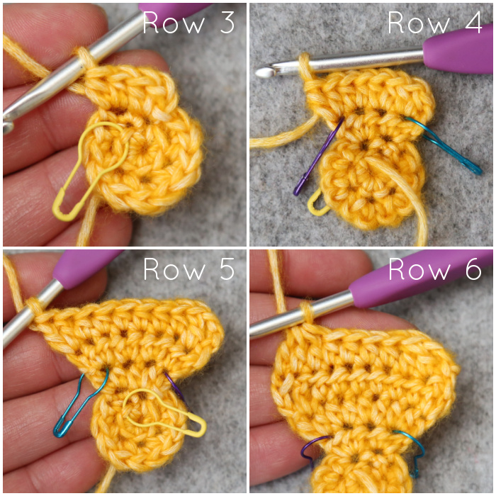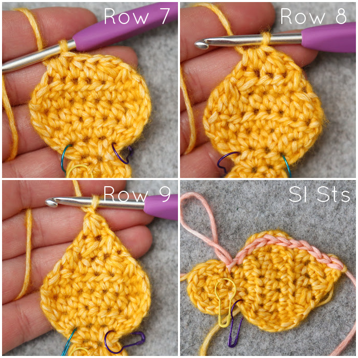 Important: When making the first, third, and fifth Petals, please mark the first and last hdc of Row 3 with a SM, leaving those SM in place until instructed to remove them. I find it easiest to mark them once I’ve completed Row 4.