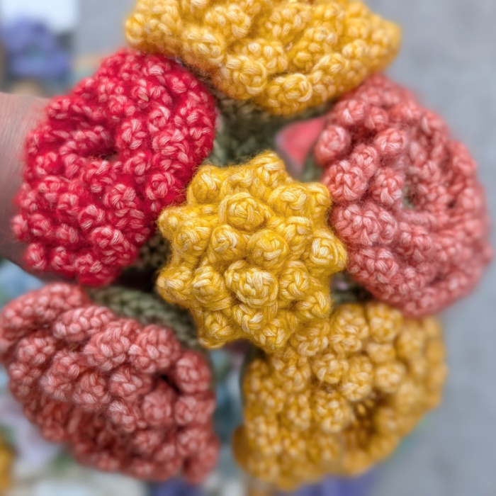This crochet Popcorn Flower (Craspedia) pattern is part of my Lucy Wall Bouquet series – a growing collection of crochet flowers designed to be combined into a textured, long-lasting floral display.