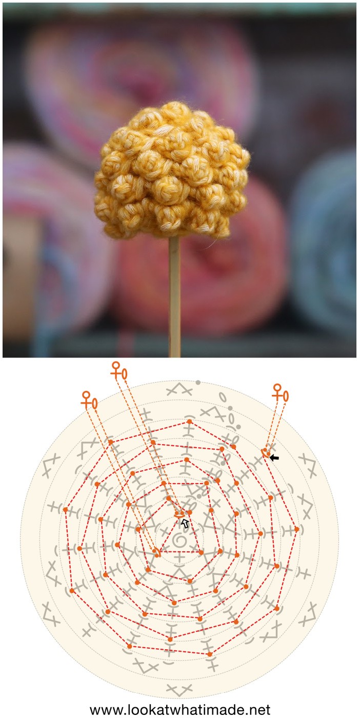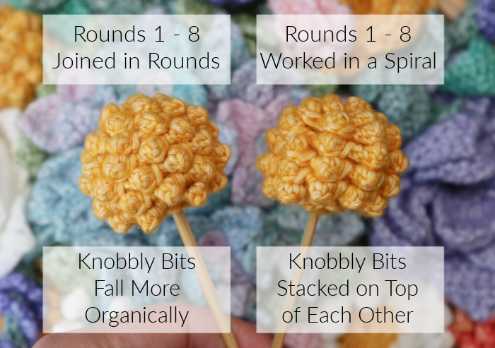- Rounds 1 – 8 are joined at the end of every round. The ‘Knobbly Bits’ are worked in a spiral. If you need some help with that, you can see This Joining Tutorial. If you are tempted to do Rounds 1 – 8 in a spiral, please note that your Craspedia will look less ‘organic’. In this pattern, we will be counting the sl st as a st when making the Knobbly Bits.