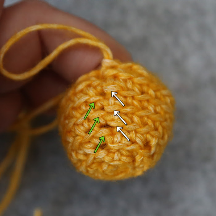When making the Knobbly Bits, you will work into the unworked front loops only. These will form a dotted line around your ball. When identifying which stitches to work into or skip, please count the sl sts as well (marked with white arrows in the photo below). This will ensure that you ‘Knobbly Bits’ are offset and ‘organic’. Green arrows indicate the first FLO of each round.