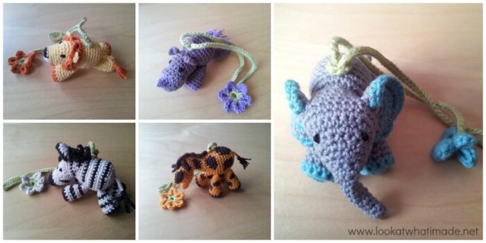 On each animal you will need to add a ch-3 loop to attach the flower string to. This is a slight alteration from the published patterns. Below you will find the links to the patterns, as well as the changes for the rounds that will contain the ch-3 loop.