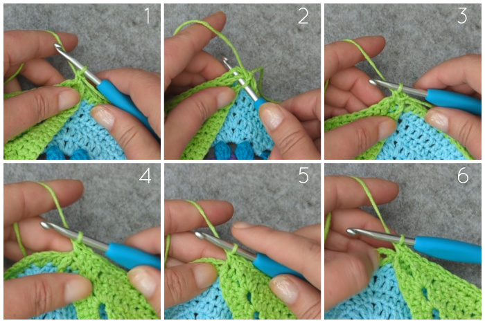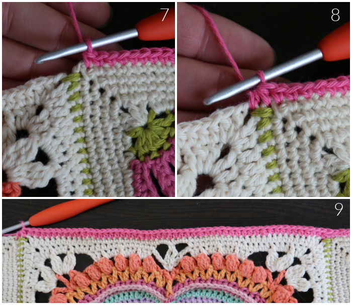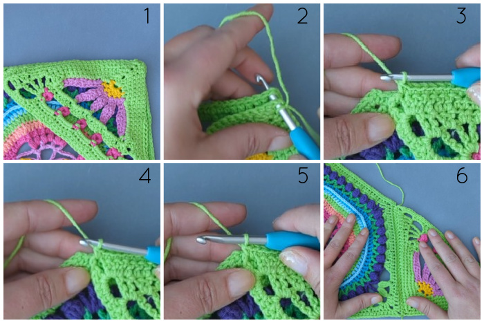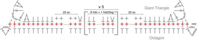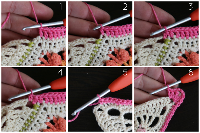 Join your yarn by making a standing sc in the ch-3 corner sp of the Giant Triangle and the first st after the corner ch-2 sp of the Octagon {Photo 1}. Make a sc into the same ch-3 sp of the Giant Triangle and the next st of the Octagon {Photos 2 and 3}. Sc in the next 117 sts {Photo 4}. Sc in the next ch-3 sp of the Giant Triangle and the next st of the Octagon {Photo 5}. Sc in the same ch-3 sp of the Giant Triangle and the last st of the Octagon {Photo 6}. Fasten off and work away your ends.