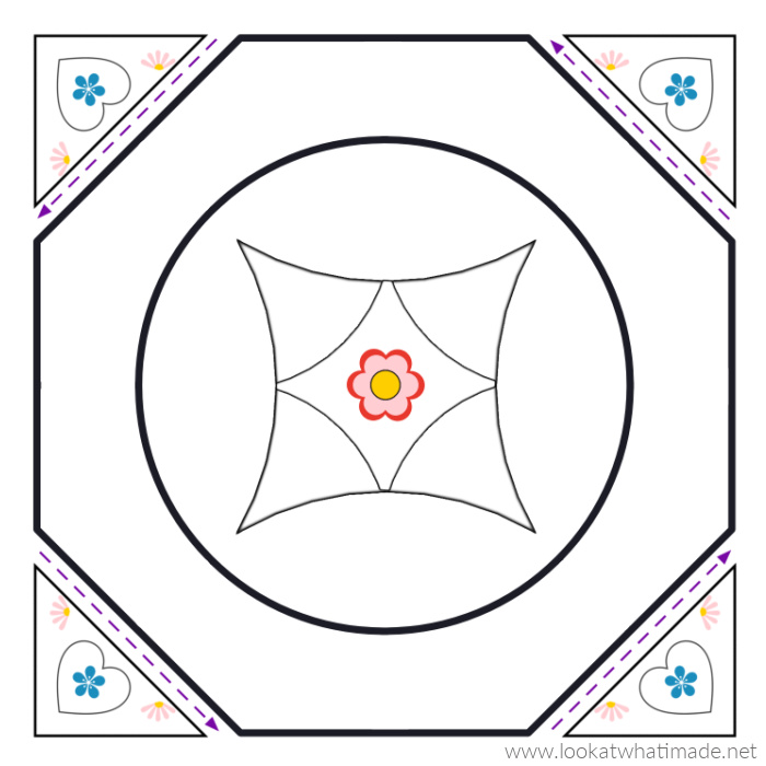 You will be joining the Giant Triangles to the four sides of the Octagon that fall over a Large (pointy) Petal. Visually, I prefer it this way, but you are, of course, welcome to join them to the other four sides if you prefer.
