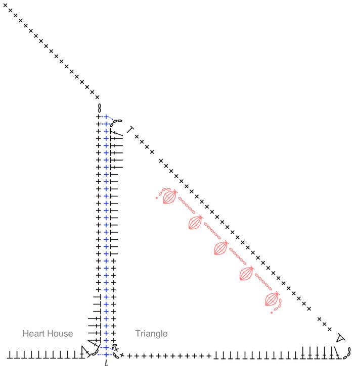You will need to attach a Triangle to each side of each Heart House so that they form Giant Triangles. You can use the same hook for the joining as you have used for the rest of the blanket, but I always find it better to go up a hook size when joining. I prefer my joins to have a little bit of ‘give’/elasticity. The choice is yours.