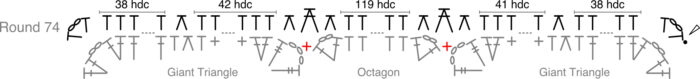 - Long Side: 117 sts {50 sc, 55 hdc, 6 hdc2tog, 4 dc, and 2 tr}