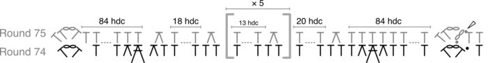 *Skip the first (hidden) st. Hdc in the next 84 sts. Hdc2tog, hdc in the next 20 sts. (Hdc2tog, hdc in the next 13 sts) 5 times. Hdc2tog, hdc in the next 18 sts. Hdc2tog, hdc in the last 84 sts. [Hdc, ch 2, 2 hdc] in the next ch-2 corner sp.*