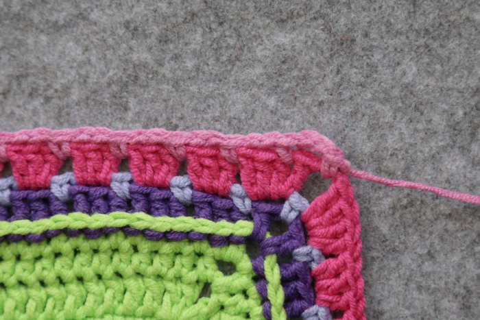 - If you are using the same colour: [Ch 1, sc, ch 2, sc] in the ch-2 corner sp.