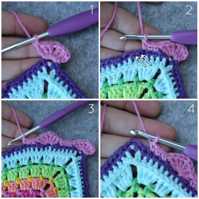 *Skip the next 2 sts, the first of which will be hidden. Sc in the next 3 sts {Photo 2}, skip the next 2 sts {Indicated with arrows in Photo 2}. ([3 dc, ch 1, 3 dc in the next st, skip the next 2 sts, sc in the next 3 sts {Photo 3}, skip the next 2 sts) until you get to the next ch-2 corner sp {Photo 4}. [3 dc, ch 1, 3 dc] in the ch-2 corner sp.*