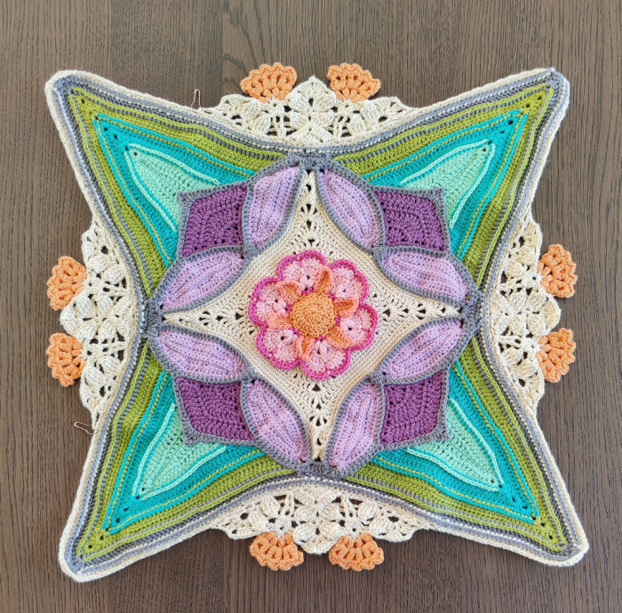 Once you have made a Flower in each of the 2 5-dc groups from Row 7, you can either continue with Part 4 to complete this side (if you are following along later when Part 4 has already been released), or you can repeat Leaves Part 1 and the Flowers for each of the remaining three sides so that you are ready to start Part 4.