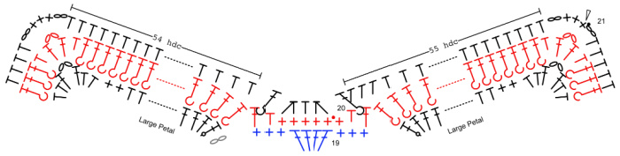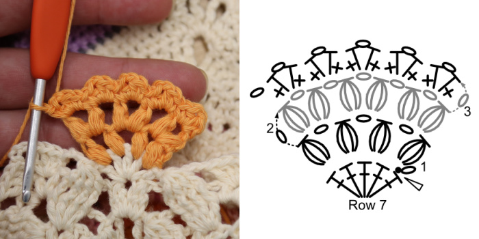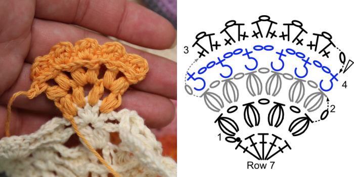 You will need to make two of these Flowers before continuing with Row 8, one in each of the 5-dc groups from Row 7.