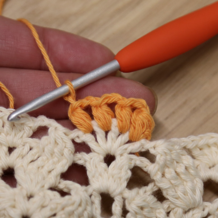 With RS facing, [sc, hdc, ch 1, hdc, sc] in each of the 5 ch-1 sps. I’m going to call these Small Scallops. Ch 1 and TURN.