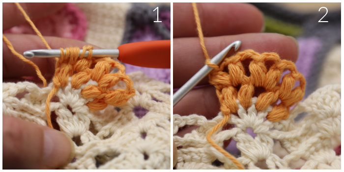 With RS facing and a slip knot already on your hook, join your yarn by making a sl st between the first and second dc of one of the two 5-dc groups in Row 7. Ch 1 (doesn’t count as a st). Make a Puff st between the first and second dc, remembering that the Puff st is closed with a ch. Ch 1. (Make a Puff st between the next 2 dc, ch 1) 3 times. TURN.