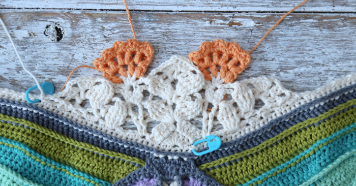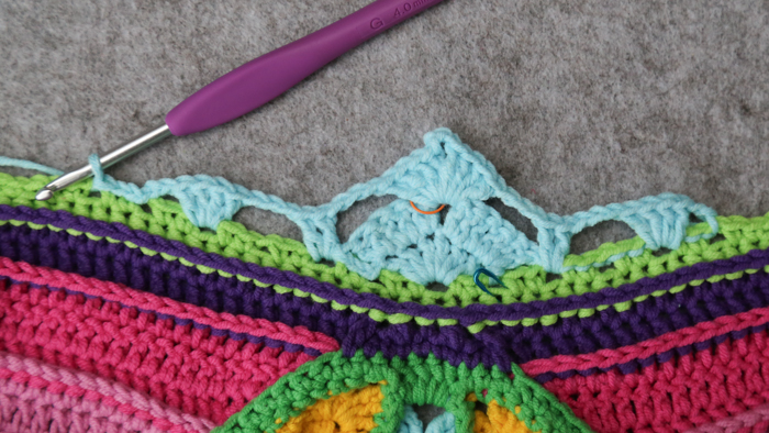 Before you continue with the Flowers, check that you have 9 unworked ch-1 sps remaining (from Row 23) on either side of the Row 1 – 7 Part. Once you have checked this, you can remove the SM from Row 1. I’m serious! Check it and avoid lots of frogging later!!