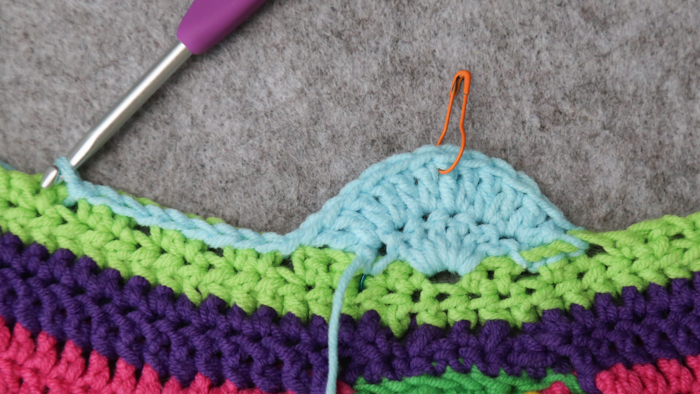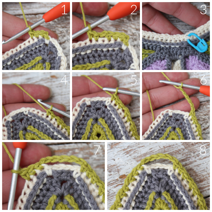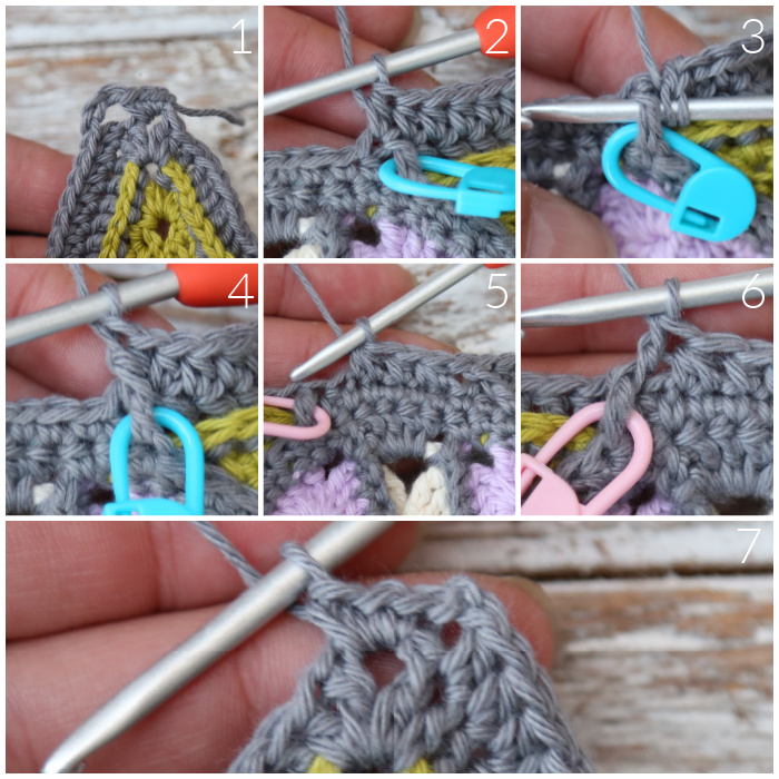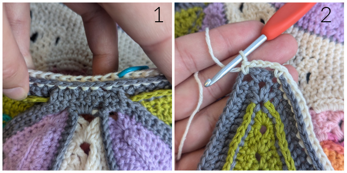 If you want to make Part 3 and 4 on each side, instead of doing Part 3 on all four sides first and THEN Part 4 on all four sides, you don’t have to cut your yarn at this point. You can just pull up a long loop and put a SM in it for later.