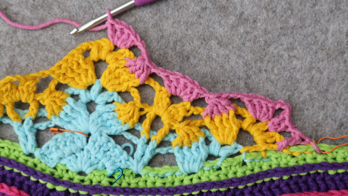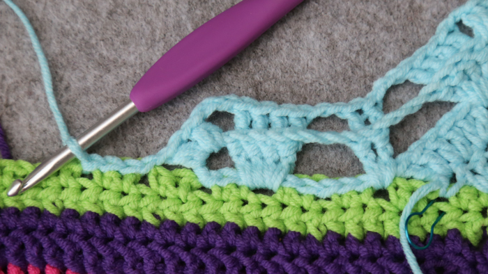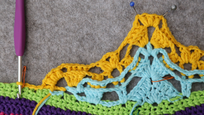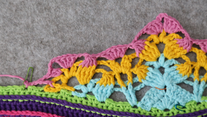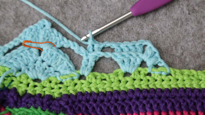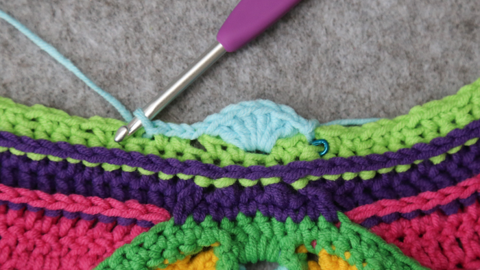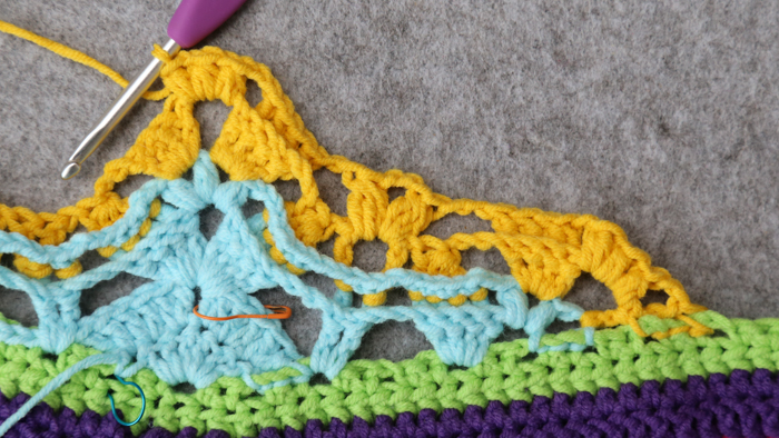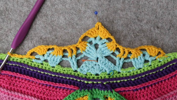 The next bit of the pattern is lacy, with a fair few ch sps and a lot of things being skipped. In the interest of using less words (and sparing your brain), I won’t mention every st/sp to be skipped, only the ones where not doing so may cause confusion.
