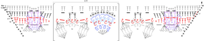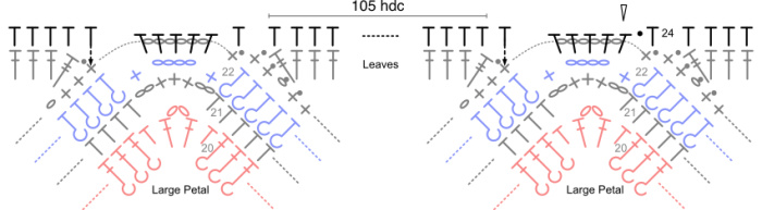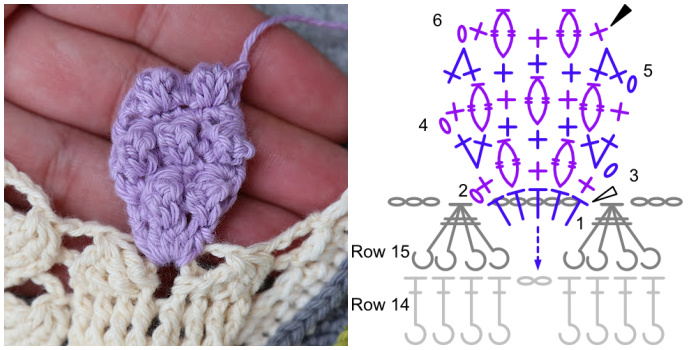 You will need to make two of these Flowers before continuing with Row 16, one in each of marked ch-2 sps from Row 14. You can find the chart and a photo at the bottom of Row 6.