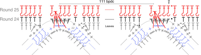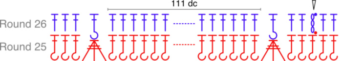 *Working in front of Rounds 22 and 23, make a tr3tog, working into the first ch-2 sp from Round 21, the second sc of Round 21, and the last ch-2 sp of Round 21. Skip the next hdc, BPdc in the next 111 sts, the first of which will be the fifth hdc made into the ch-4 sp.*
