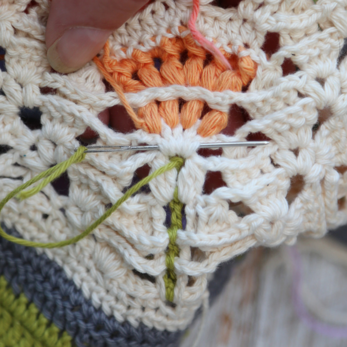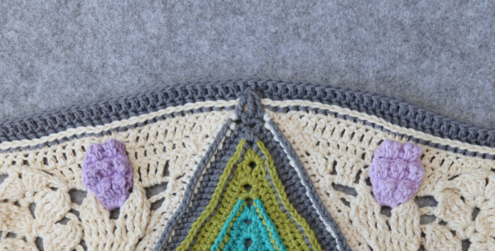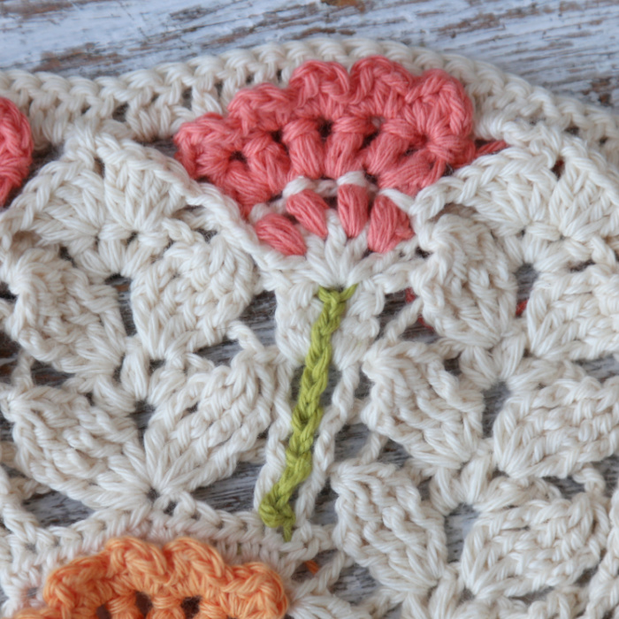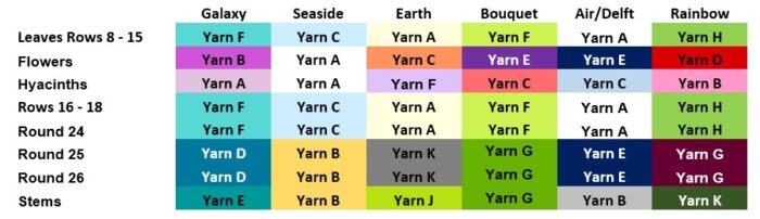 Do not work away your ends yet! You will use them to secure the hyacinths when you’ve made Row 18.