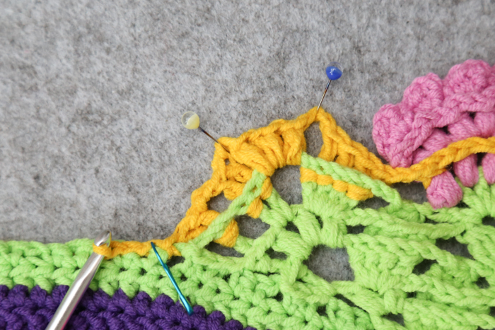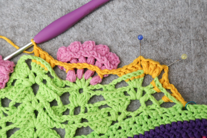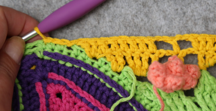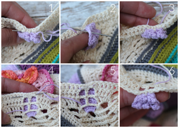 For the hyacinths, work your ends away through the 5 sts of Row 18 above the hyacinth {Photo 1}. Catch the last st of the hyacinth by inserting your needle from back to front into that st {Photo 2} and then inserting it from front to back between the hdc and dc from Row 18. Pull your yarn tight {Photo 3}. Turn your work around and work the ends away at the back of your work {Photos 4 and 5}. Photo 6 shows how this attaches the hyacinth to Row 18.
