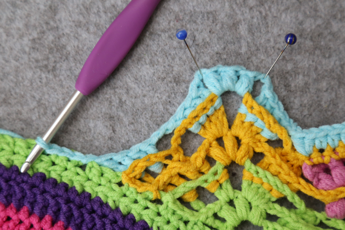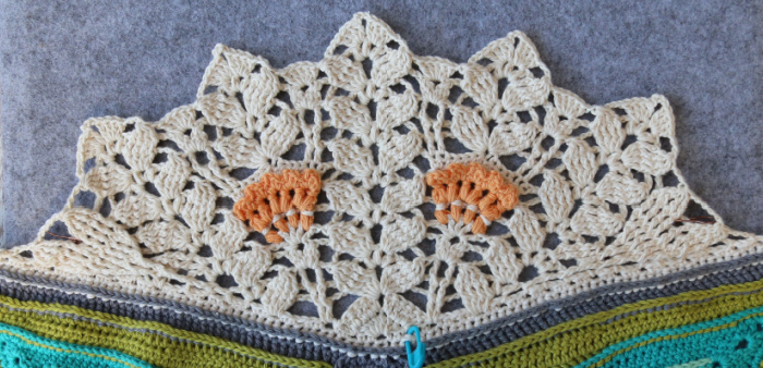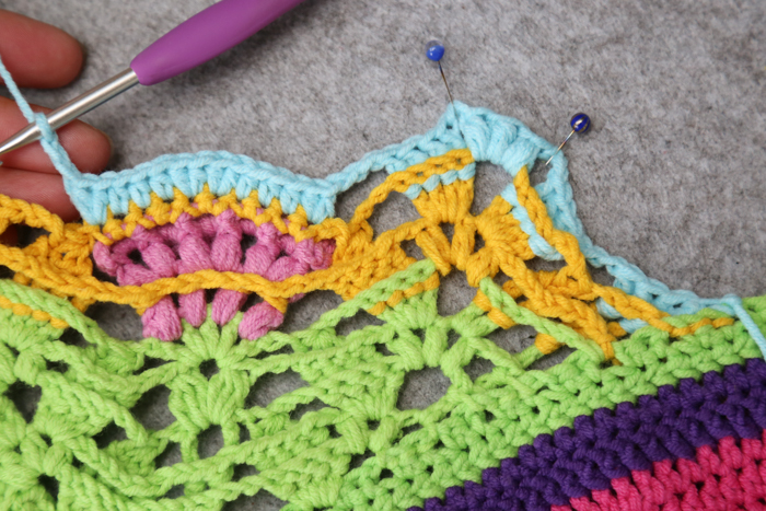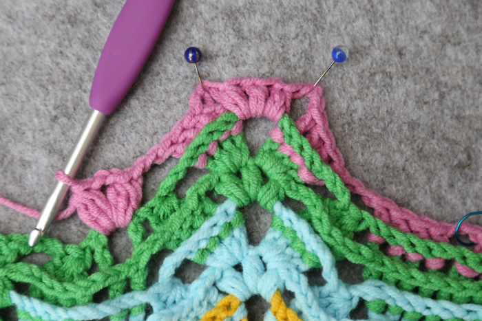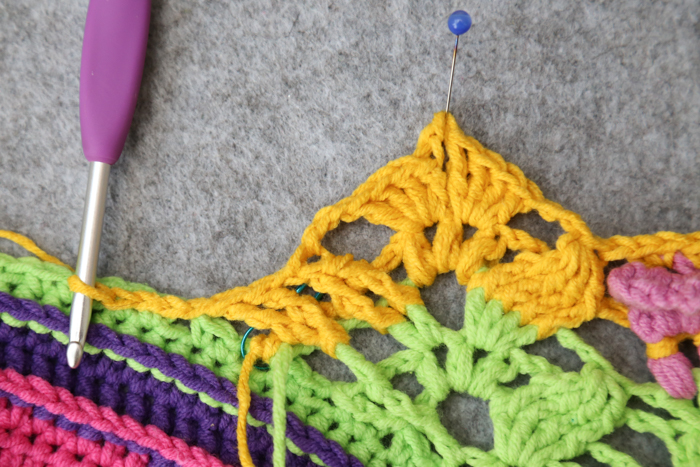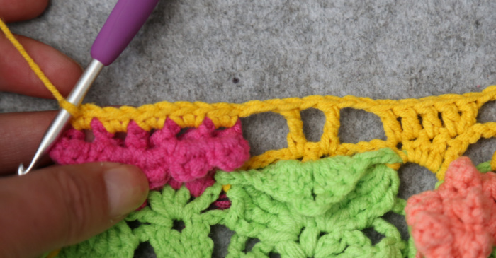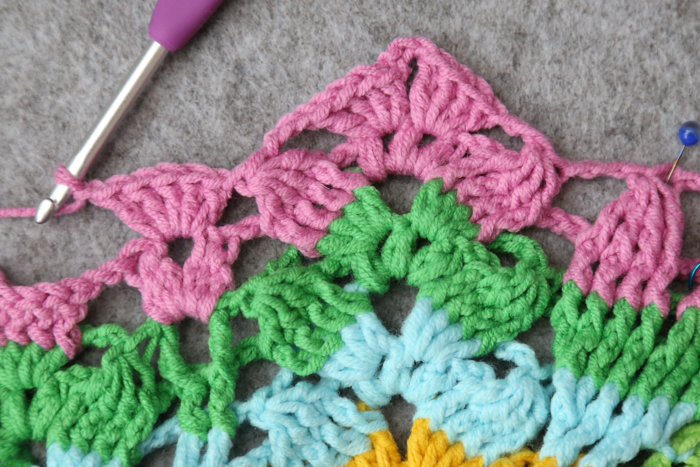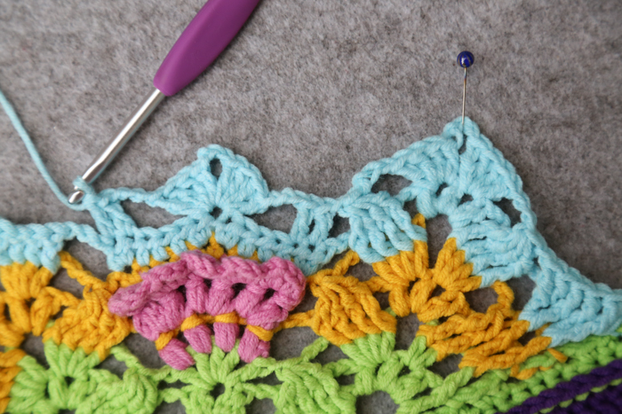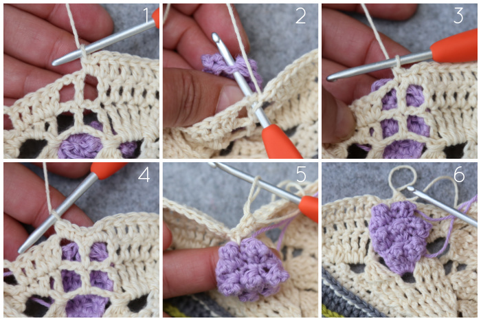 You will need to make four of these Flowers before continuing with Row 16, one in each of the 5-dc groups from Row 15. Please see the charts and photo tutorials in Part 3 if you need help with this.