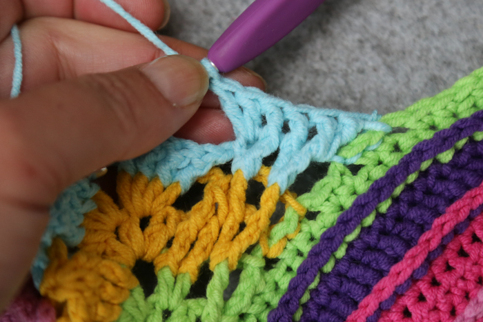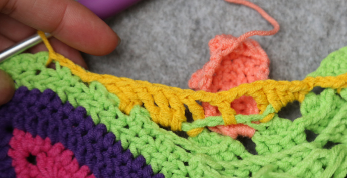 Work your end away to the back of your work, working through the bottom of the 5 dc from Row 7.