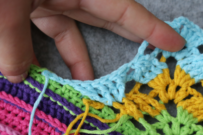 Once you have located that hdc from Row 10, join your yarn by making a sl st in that hdc, working BETWEEN the 2 dc.