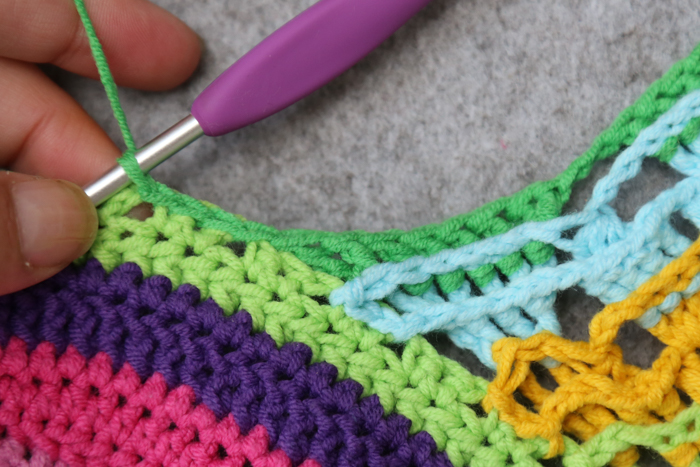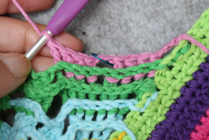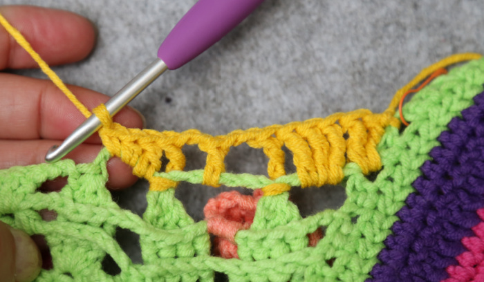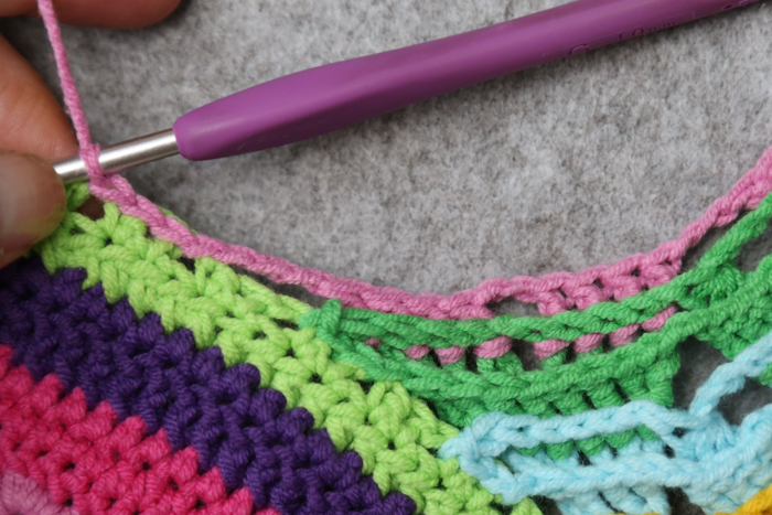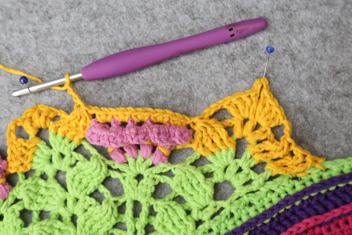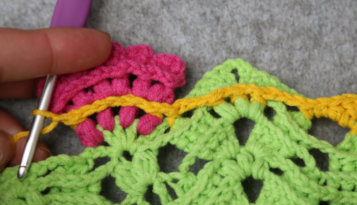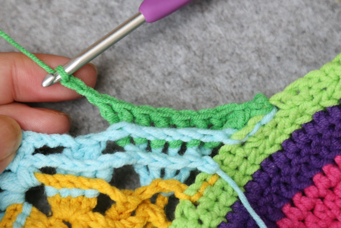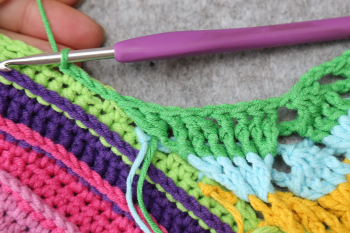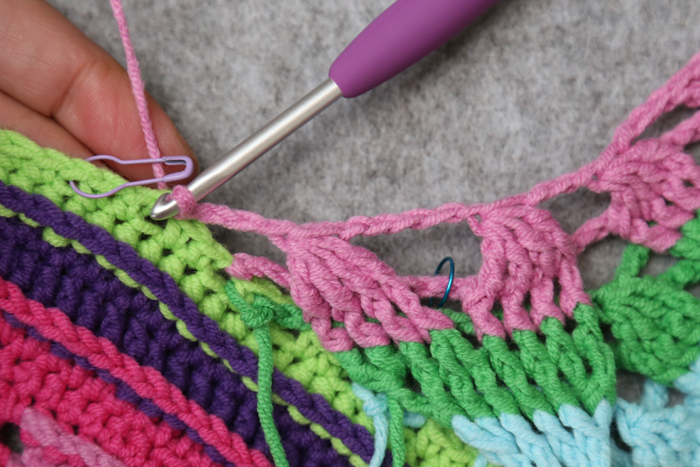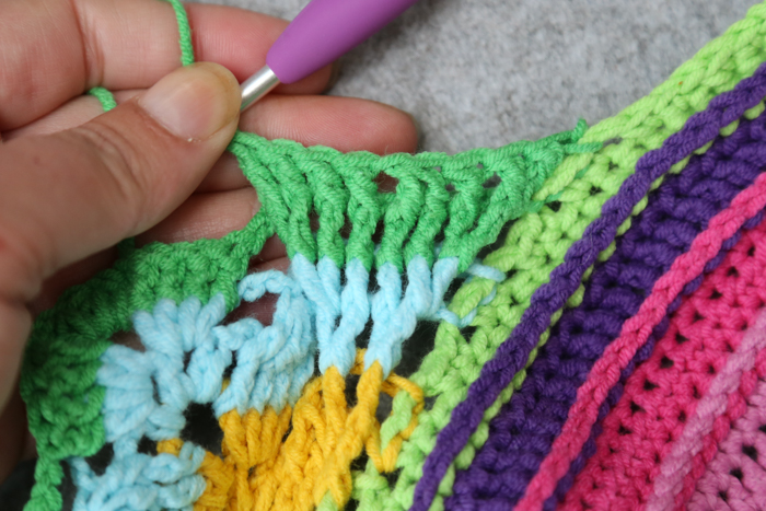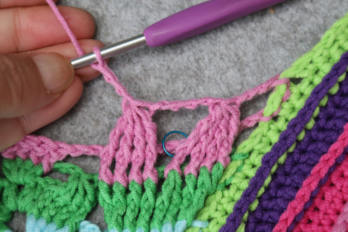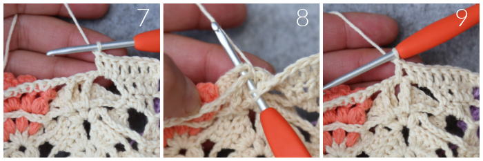 Ch 2 {Photo 4}, sl st between the top of the 2 dc from Row 3 {Photo 5}. Ch 1, sl st between the top of the 2 BPdc from Row 4 {Photo 6}. Ch 2, sl st between the top of the 2 FPtr from Row 5, also working between the 2 3-dc Bobbles from Row 6 {Photo 7}.