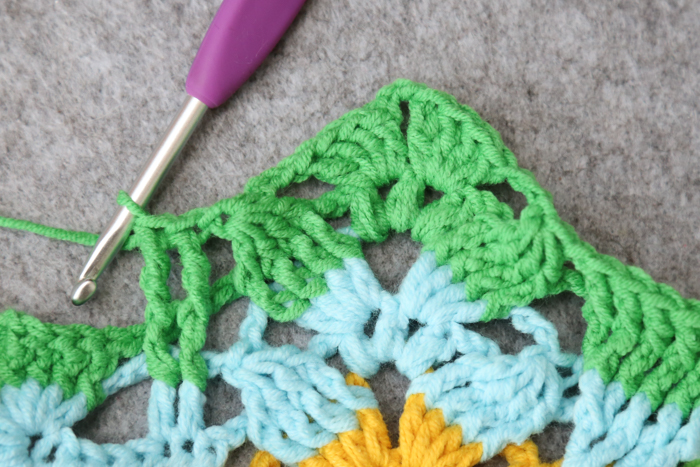 Sl st in the next 2 sts, sl st in the next ch-1 sp. There should now be 6 ch-1 sps left unworked before the corner. TURN.