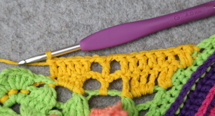 *Ch 2, skip the next ch-3 sp. Tr in the next ch-1 sp, ch 1, tr in the next ch-1 sp, ch 2. You may find it helpful to fold Row 15 over so that you can see the ch sps of Row 16 better. Working into the ch-2 sps from Flower Row 4 (behind your work), make 2 sc in each of the 5 ch-2 sps.*