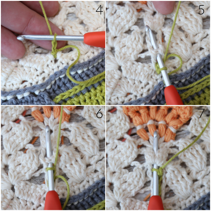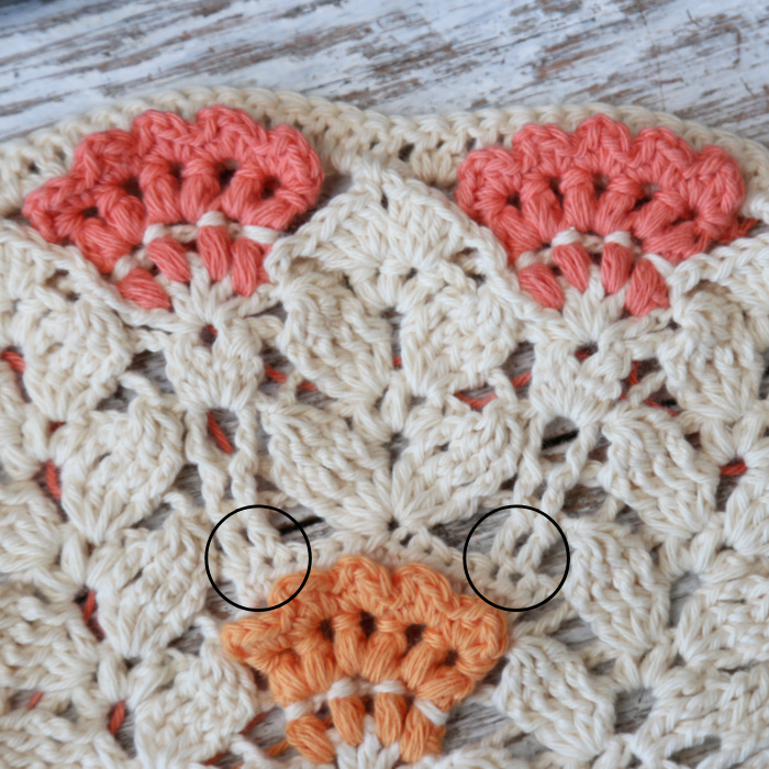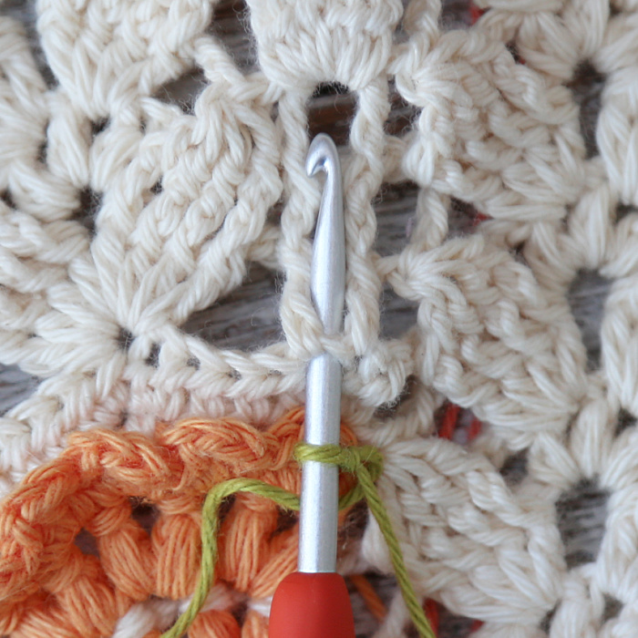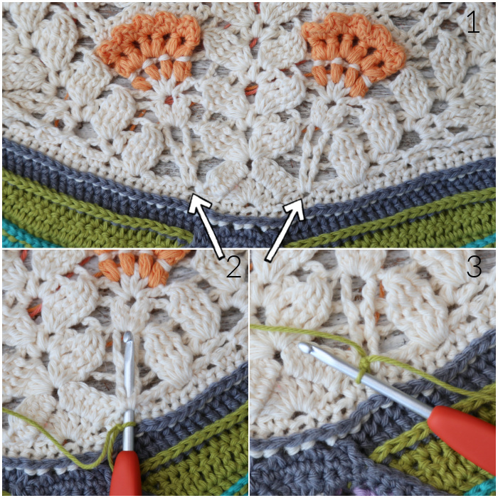 With a sl knot already on your hook, join your yarn by making a sl st in one of the ch-1 sps of Round 23 that contains the 2 dc from Row 3, working BETWEEN the 2 dc {Photos 1 – 3}.