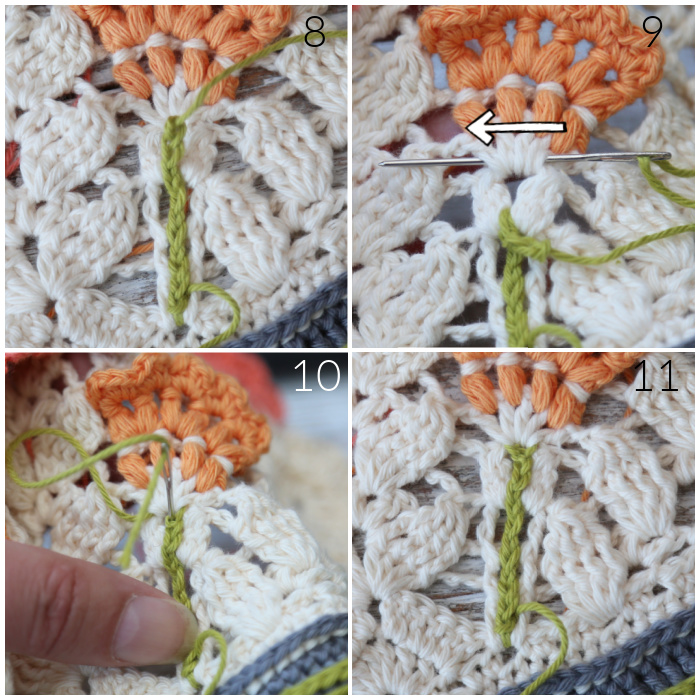 Ch 3, cut your yarn, and gently pull the end all the way through {Photo 8}. Thread a yarn needle with this end. Working from right to left (left to right, if you are left-handed), work your end away through the 5 dc of Row 7 {Photo 9}. Insert your needle from front to back into the last ch of the Stem {Photo 10} and then to the back of your work. Pull tight so that the ch is neat {Photo 11}.
