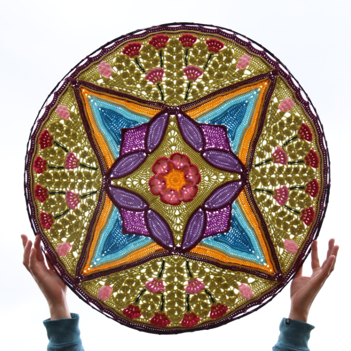 At the end of this part, you will have a giant mandala. This is what it would look like if you chose to make it only up to this point and fit it into a hoop. You will be super pleased to know that, from next week onwards, we will be working in rounds ALL the way around this mandala. You can give your stitch markers a little holiday!!
