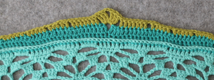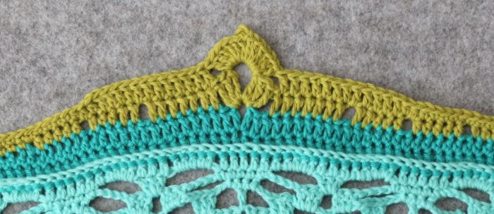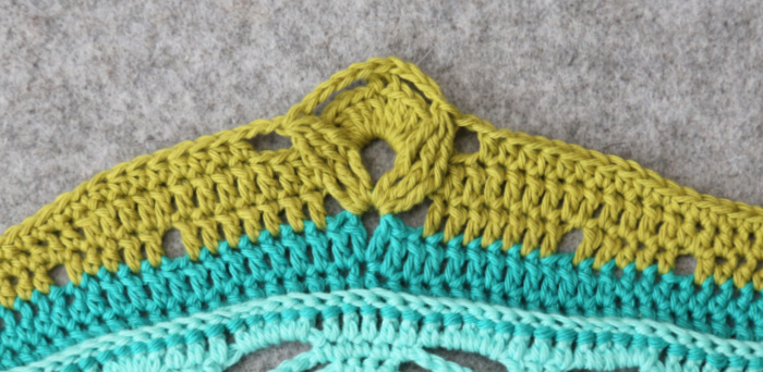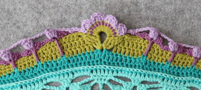 When making the Scallops that fall over the Popcorns in this round, the last sc of each repeat should fall in the hdc2tog from the previous round. This round will ruffle a bit, don’t worry about it.