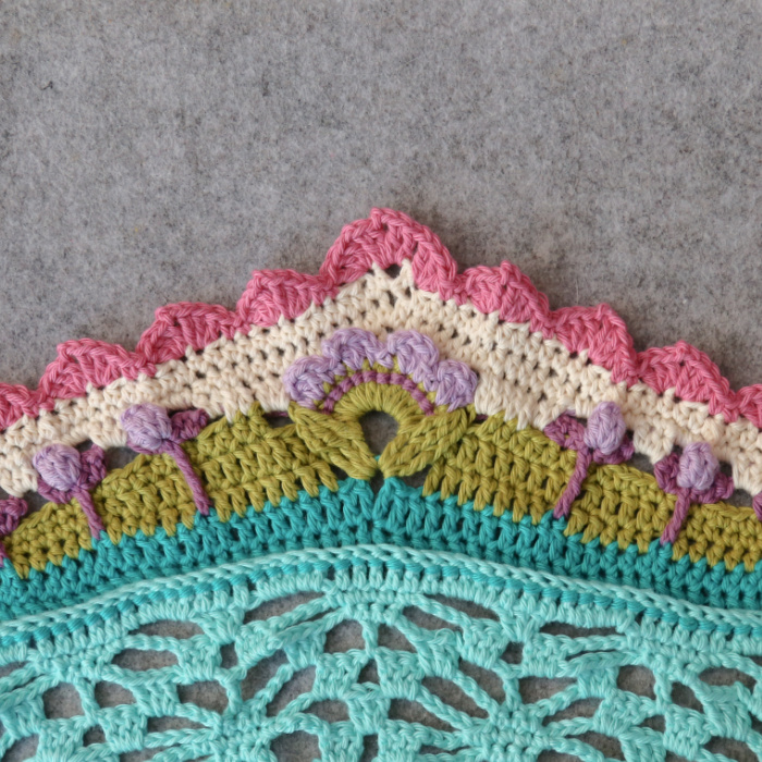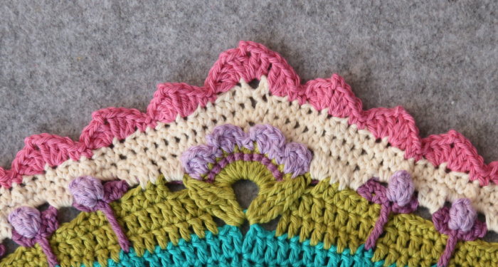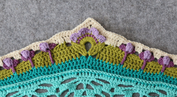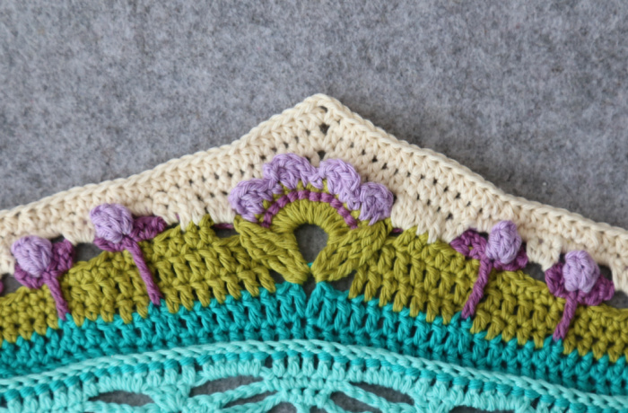 Rep from * to * 7 more times, omitting the last Corner Flower on the last repeat. Join to the first sc with a sl st. Fasten off and work away your ends.