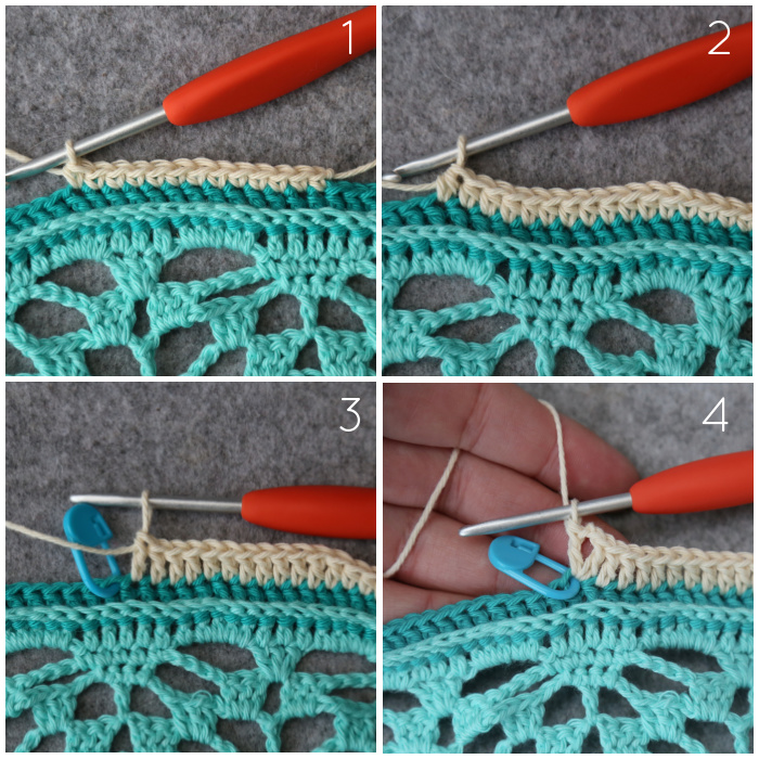 Join your yarn by making a standing sc in any ch-3 picot around {Photo 1}. Mark this first sc with a SM and don’t remove the SM until you have worked into it in Round 45.
