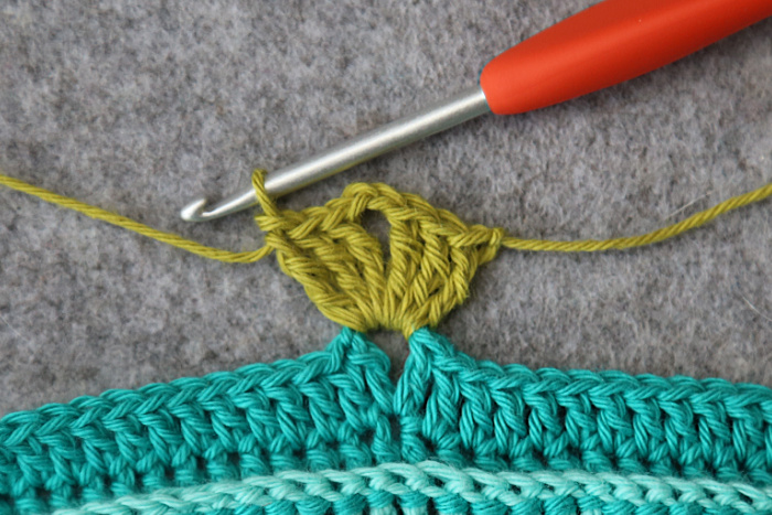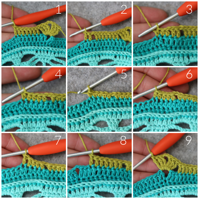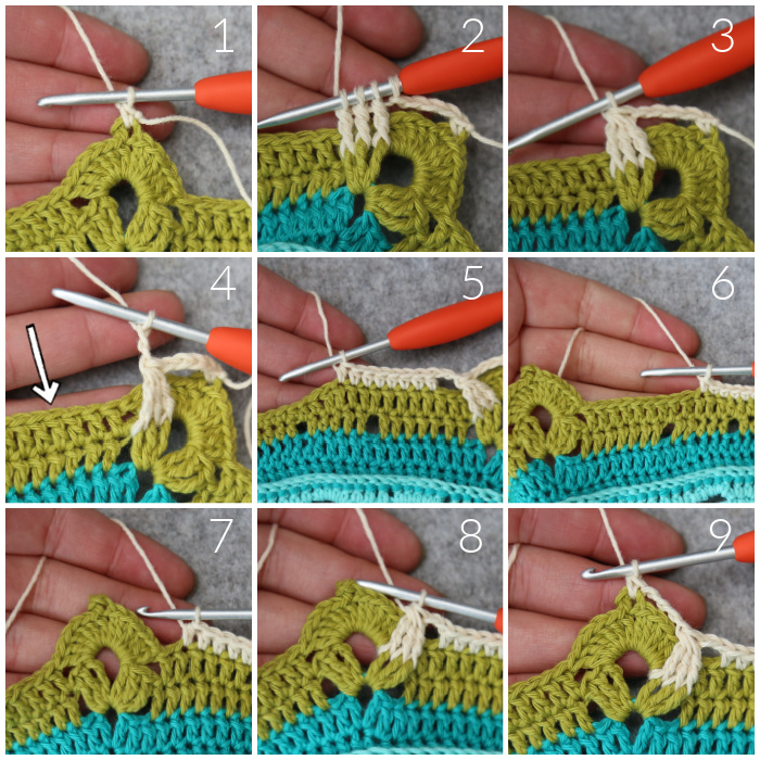 (Ch 1, skip the next st, sc in the next 5 sts) 5 times {Photo 5}. Ch 1, skip the next st, hdc in the next 5 sts {Photo 6}. Ch 1, skip the next st, hdc in the next 3 sts, dc in the next 2 sts {Photo 7}. Ch 1, skip the next st, dc in the next 7 sts {Photo 8}. Skip the next 2 sts. [3 tr, ch 2, 3 tr] in the next ch-2 sp {Photo 9}.*