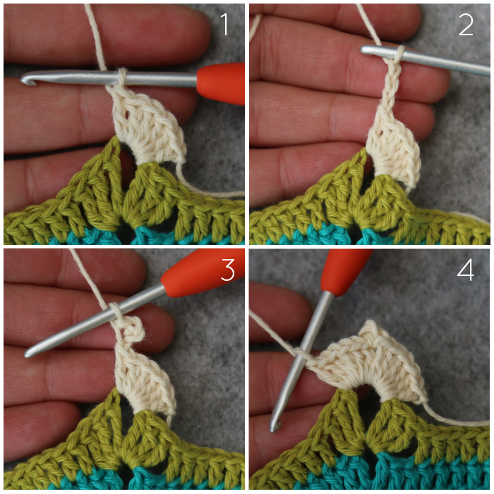 Ch 1, sc in the same st as the sl st join. Sc in the next 12 sts {Photo 1}. Hdc in the next 12 sts {Photo 2}, dc in the next 12 sts {Photo 3}. [Dc, ch 2, dc] in the next st, which should be the marked BPdc {Photo 4}. Remove the SM.