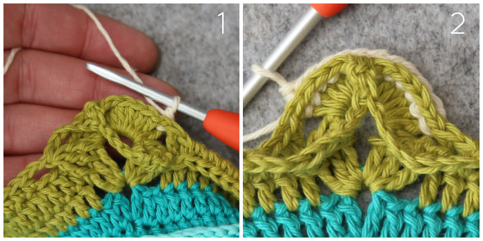 Join your yarn by making a standing BPsc around the first dc in any 12-dc corner group from Round 41 {Photo 1}. BPsc around the next 11 dc {Photo 2}. This is your corner made.