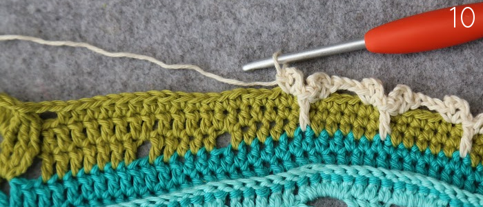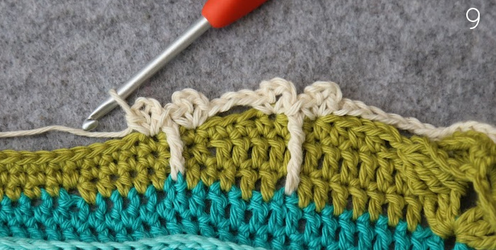 Rep from * to * 7 more times, omitting the last sc on the last repeat. Join to the first sc with a sl st. Fasten off and work away your ends.