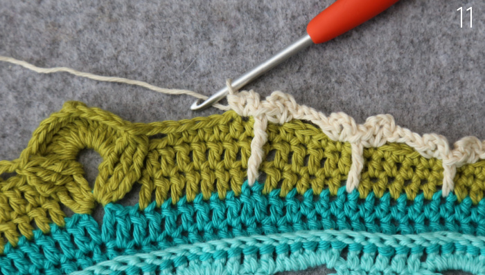 (Sc in the next ch-1 sp, sc in the next 5 sts) 5 times {Photo 9}. Sc in the next ch-1 sp, sc in the next 4 sts {Photo 10}. Hdc in the next st, hdc in the next ch-1 sp, hdc in the next st {Photo 11}. Dc in the next 4 sts, dc in the next ch-1 sp, dc in the next 7 sts {Photo 12}. Skip the next 3 tr. [6 dc, ch 3, sl st in the third ch from the hook to form a picot, 6 dc] in the next ch-2 sp {Photo 13}.*