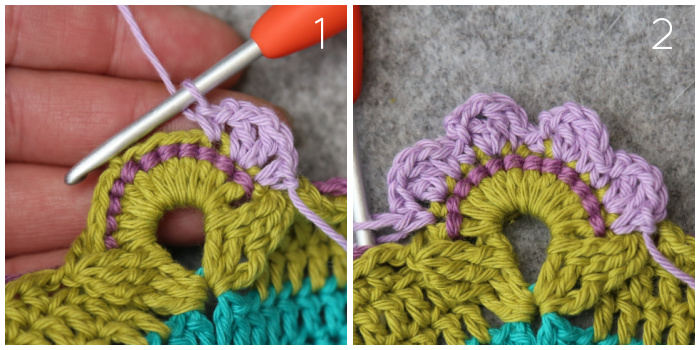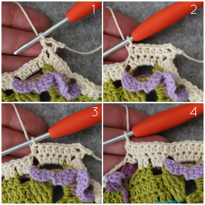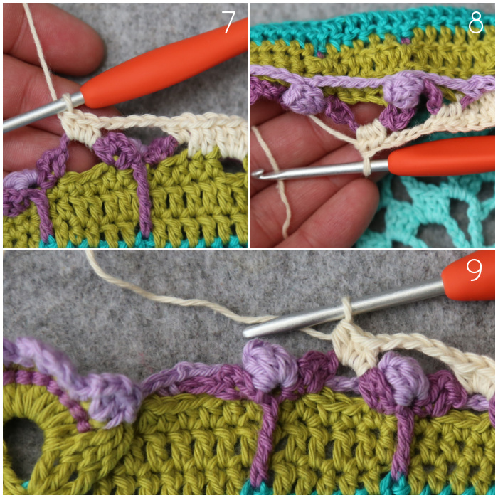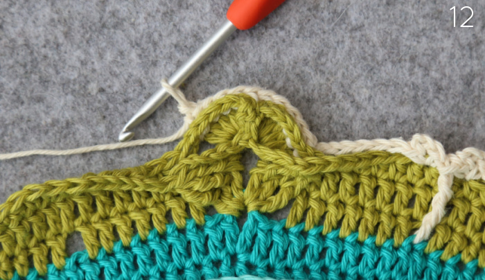(Make a FPsc around the Popcorn from Round 44 {Photos 7 and 8}. Make 2 sc in the same ch-4 sp of Round 45, working OVER the next ch-6 sp of Round 44 {Photo 9}. Skip the next hdc, sc in the next 2 hdc, working in front of Round 44 {Photo 10}. Make 2 sc in the next ch-4 sp of Round 45, working OVER the ch-6 sp from Round 44 {Photo 11}) 9 times – Photo 12.