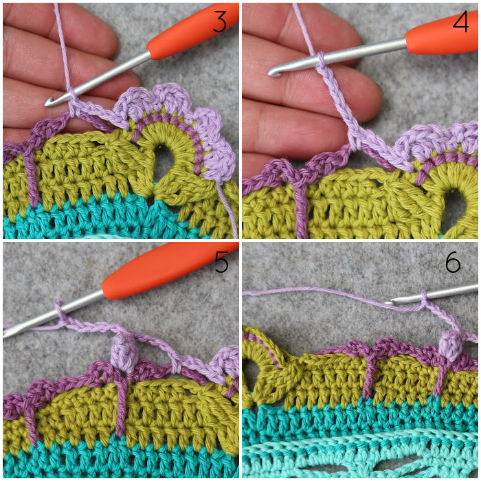 *Skip the next 2 sts, the first of which will be hidden. Dc in the next 7 sts {Photo 1}. Ch 1, skip the next st, dc in the next 2 sts, hdc in the next 3 sts {Photos 2 and 3}. Ch 1, skip the next st, hdc in the next 5 sts {Photo 4}.