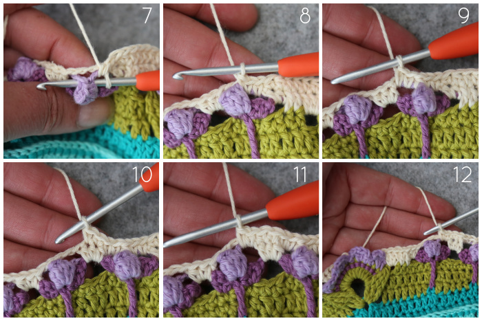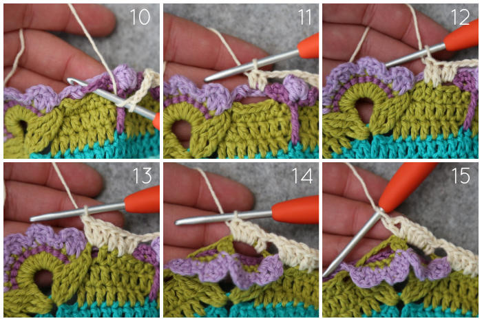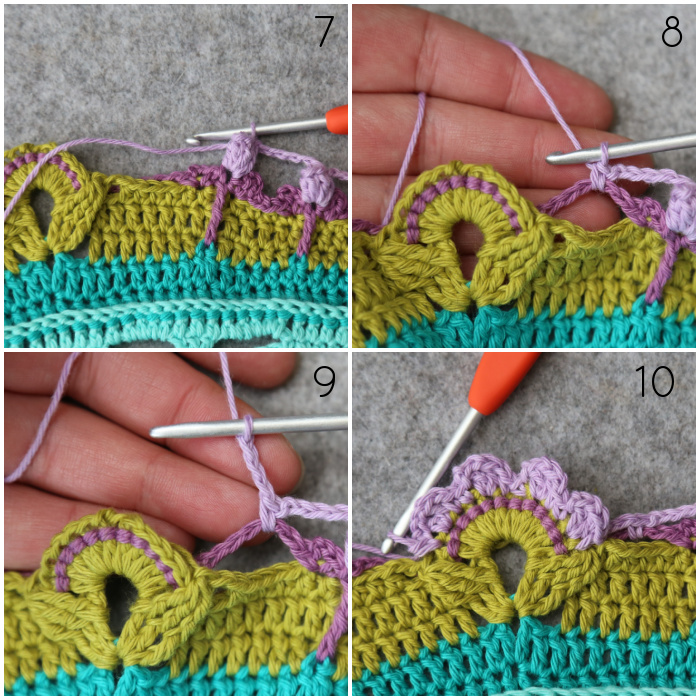 *Skip the next 3 tr, the first of which will be hidden. Dc in the next 7 sts {Photo 5}, dc in the next ch-1 sp, dc in the next 4 sts {Photo 6}. Hdc in the next st, hdc in the next ch-1 sp, hdc in the next st {Photo 7}. Sc in the next 4 sts {Photo 8}.