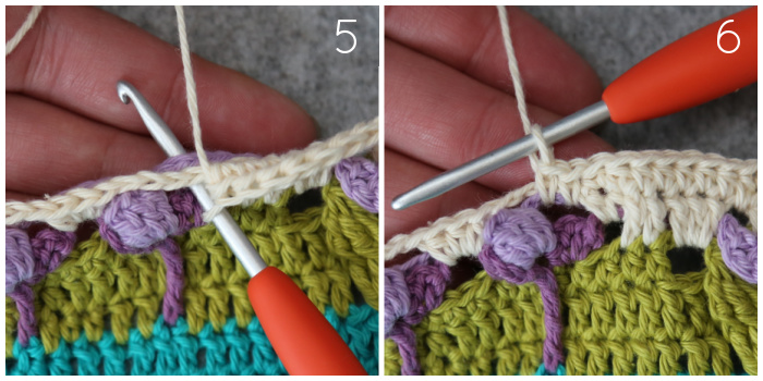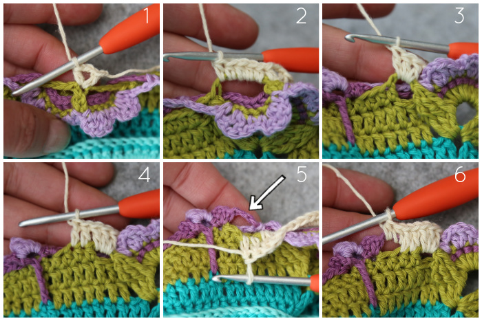 *Make 5 hdc in the next ch-4 sp {Photo 2}. Ch 1, make 3 dc in the next ch-2 sp of Round 42, working in front of Rounds 43 and 44 {Photo 3}. Still working in front of Rounds 43 and 44, skip the next hdc of Round 42, which will be tricky to get into anyway. Dc in the next 2 hdc, skip the last hdc {Photo 4}. Make 2 hdc in the ch-6 sp of Round 43, working in front of the ch-5 sp of Round 44 {Photos 5 and 6}.