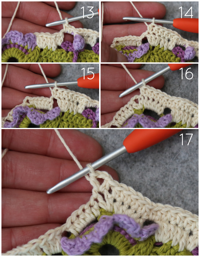 Ch 6, skip the next 4 hdc and the next ch-2 sp. BPsc around each of the 12 dc in the corner group {Photo 12}.*