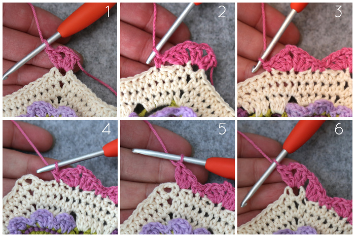 [5 dc, ch 3, sl st in the third ch from the hook to form a picot, 6 dc] in the same ch-2 sp {Photos 1 – 4}. This is your first corner made. It will be a tight fit getting all 12 dc into the corner sp. Squish them up good!
