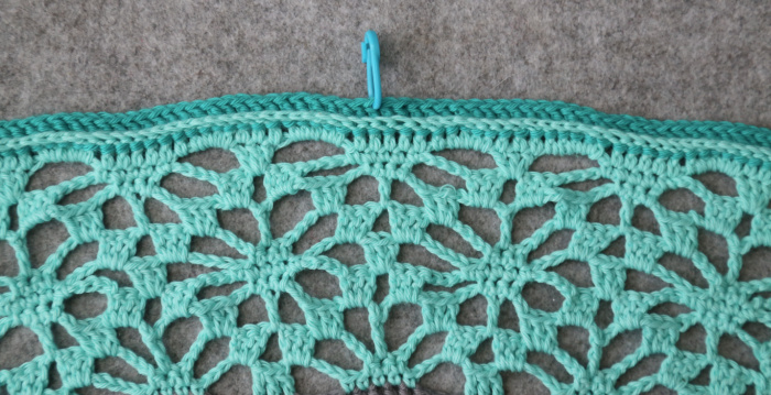 Don’t worry about the ch-4 sps in the corner for now. We will deal with them in Round 44.